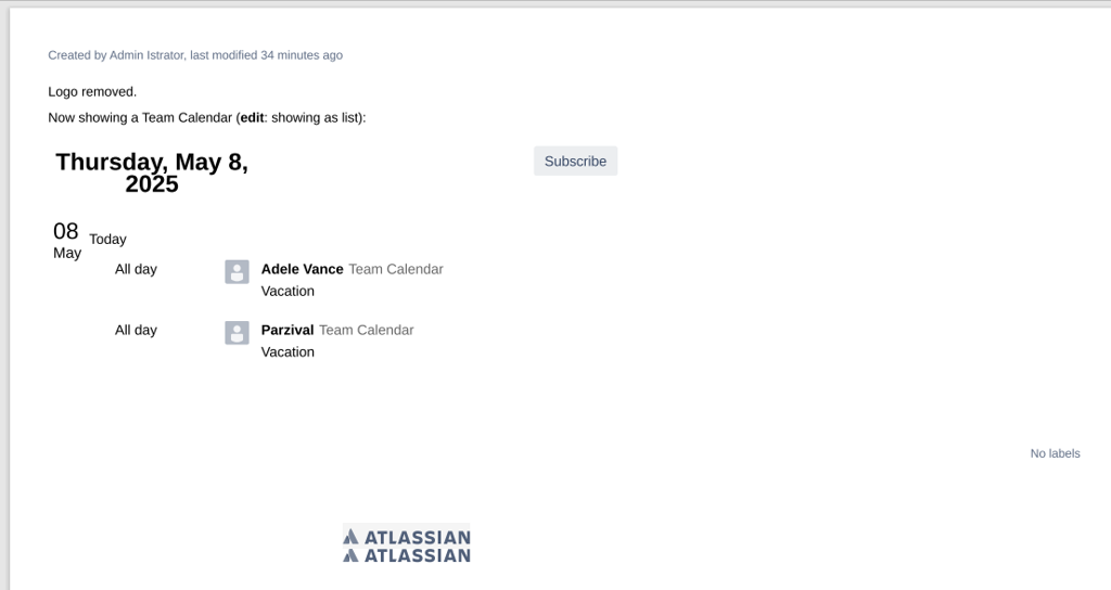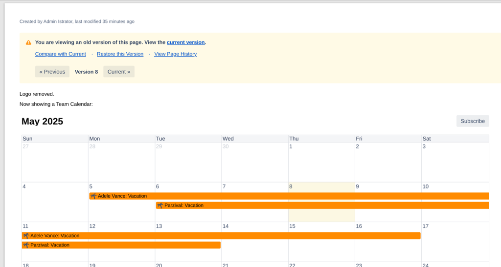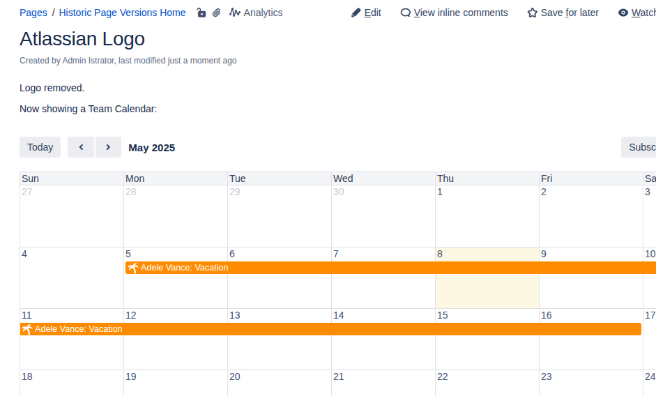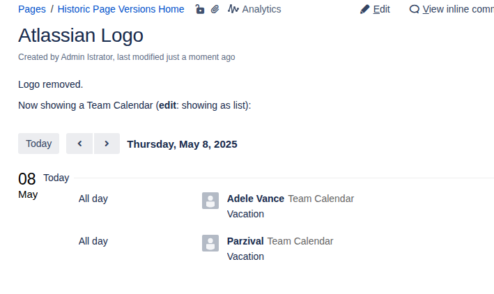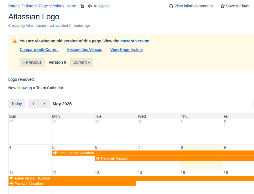 The historical Team Calendar macro correctly applies the old configuration (showing a calendar, not a list), but the vacation data is current. It shows both vacations, even though at the time this page version was created, only Adele’s vacation existed: