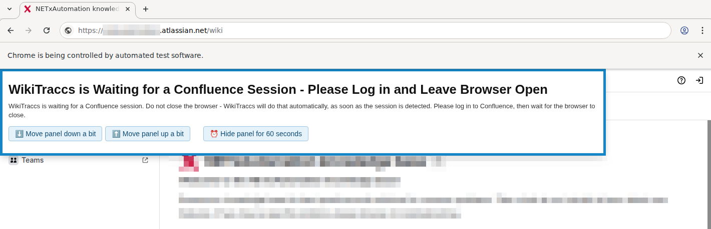 If you choose Anonymous authentication mode, WikiTraccs will still open Confluence in the remote-controlled Chrome browser. You don’t have to log in. The browser will close eventually and WikiTraccs continues, accessing Confluence using an anonymous user session.